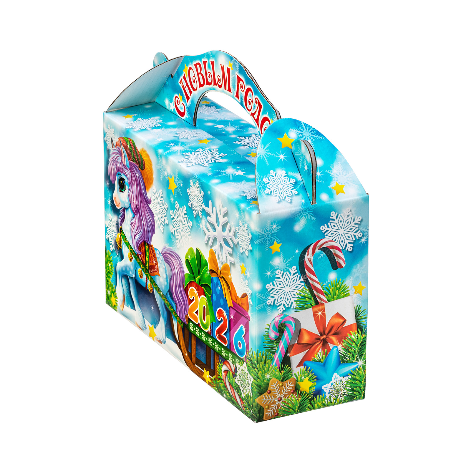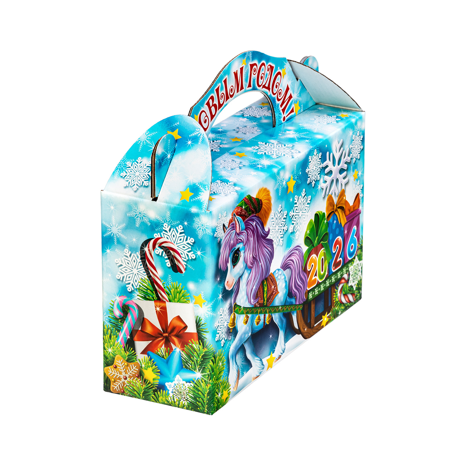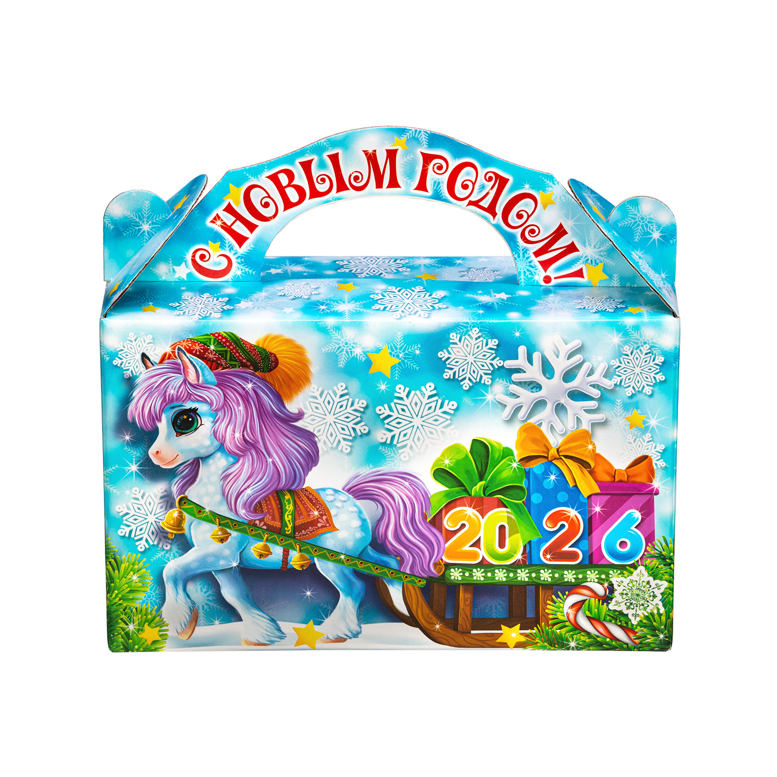 Новогодний сладкий подарок с изображением символа года - это универсальный подарок, который подойдет сластене любого возраста. “Сладкие сани” -это небольшая картонная коробочка нежно-голубого цвета, украшенная со всех сторон разными зимними узорами. На передней части изображена волшебная лошадка с фиолетовой гривой. Она везет упряжку с подарками, на которых обозначены цифры наступающего года. Сверху расположена удобная ручка с поздравительной надписью. Подарок состоит из килограмма отборных сладостей и небольшого памятного сувенира с изображением символа года.