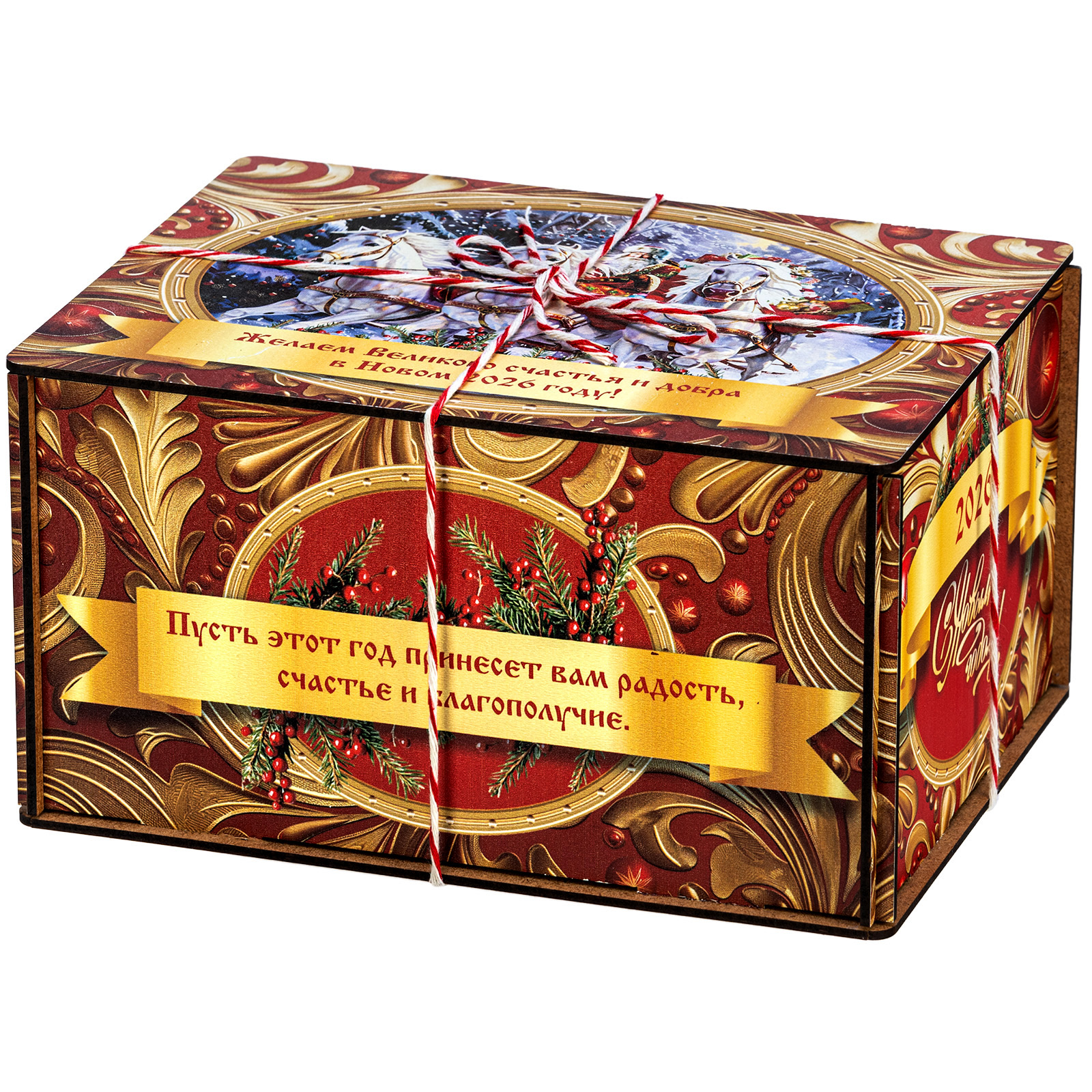 Ищете новогодний сладкий подарок подростку или взрослому? Присмотритесь к набору “Золотые узоры” - это оригинальный конфетный набор в яркой упаковке. В подарок входит килограмм вкусных и разнообразных кондитерских изделий от ведущих фабрик, а также небольшой памятный сувенир в виде символа наступающего 2026 года.  Сладости бережно упакованы в небольшой деревянный ящик, выполненный в сочетании золотого и красного цветов. На крышке есть небольшая иллюстрация с изображение Дедушки Мороза в упряжке белых грациозных лошадей. Упаковка аккуратно перетянута цветной ручкой шнурком, что еще больше добавляет ей привлекательности.